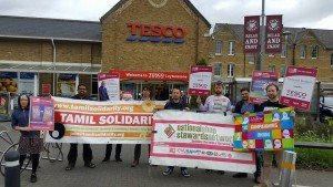 Tamil Solidarity joins the National Shop Stewards Network (NSSN) and USDAW trade union in organising a protest yesterday outside Tesco to protest to reinstate Kumaran Bose. Kumaran was sacked from Samworth Brothers for speaking out against the new contract of cuts in wages and for standing up for his and his colleague’s right. He has been victimised for unionising his work place.